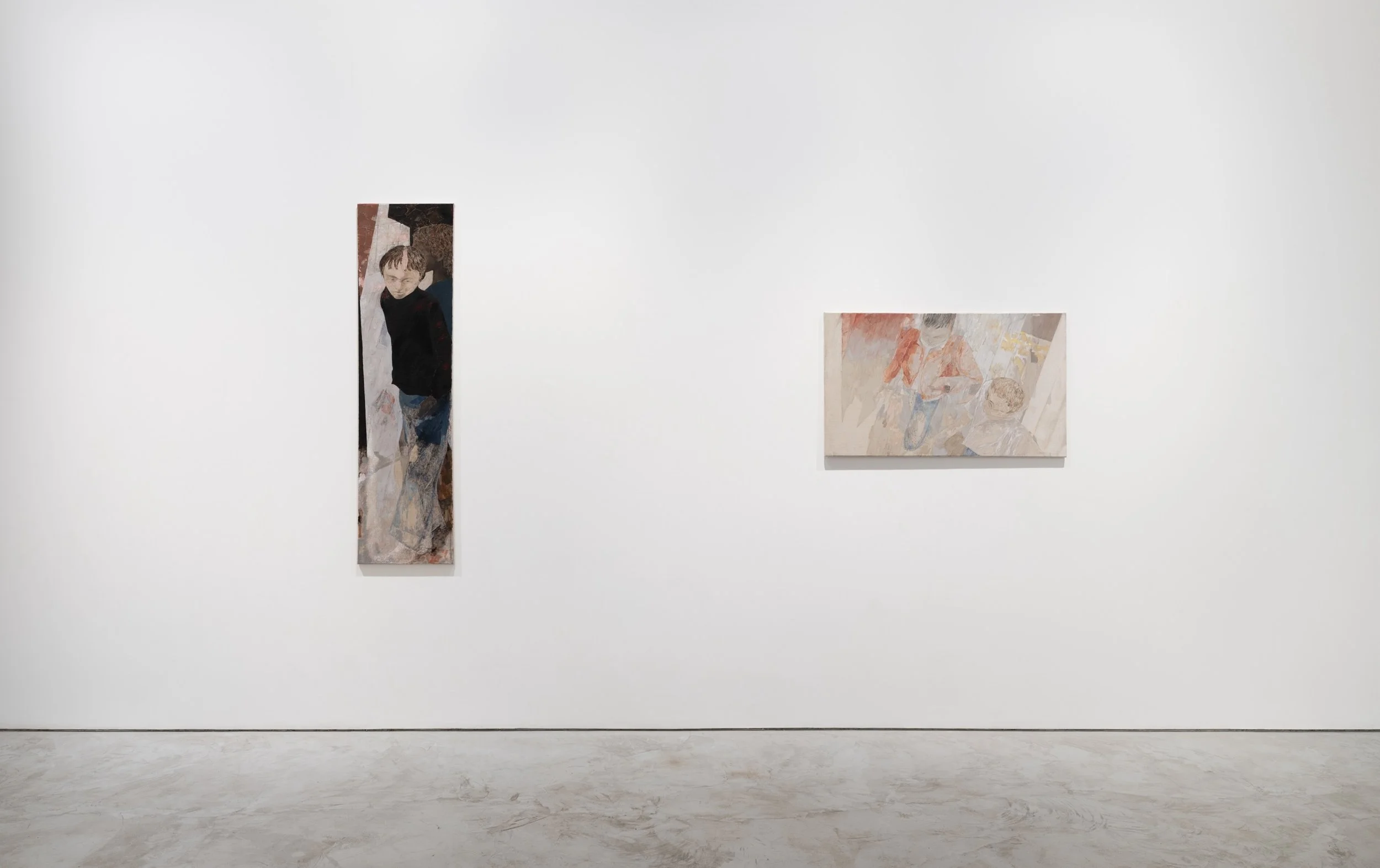 Based in Leipzig, Elias Saile paints his young, androgynous figures with similarly calm, open expressions. Saile admires near-contemporaries Kai Althoff and Yu Nishimura, as well as predecessors such as the Swiss painter Otto Meyer Amden, and Japanese-American artist Miyoko Ito. Saile often uses long, narrow canvases in either portrait or landscape orientation, a compositional effect that for the artist reflects how our imaginations are composed of countless snippets and fragments, with everything from our closest friends to faraway art apprehended through small screens. Likewise, there is a sense of hiddenness or mystery in the work, as in Untitled (2025), in which two standing figures occupy a tall, narrow canvas. While one figure turns his face toward the viewer, the face of the other is obscured. Any intimacy must be hard won, with Saile’s almost expressionless faces tilted downwards or to the side, their thoughts available to a viewer only through acts of engaged imagination.