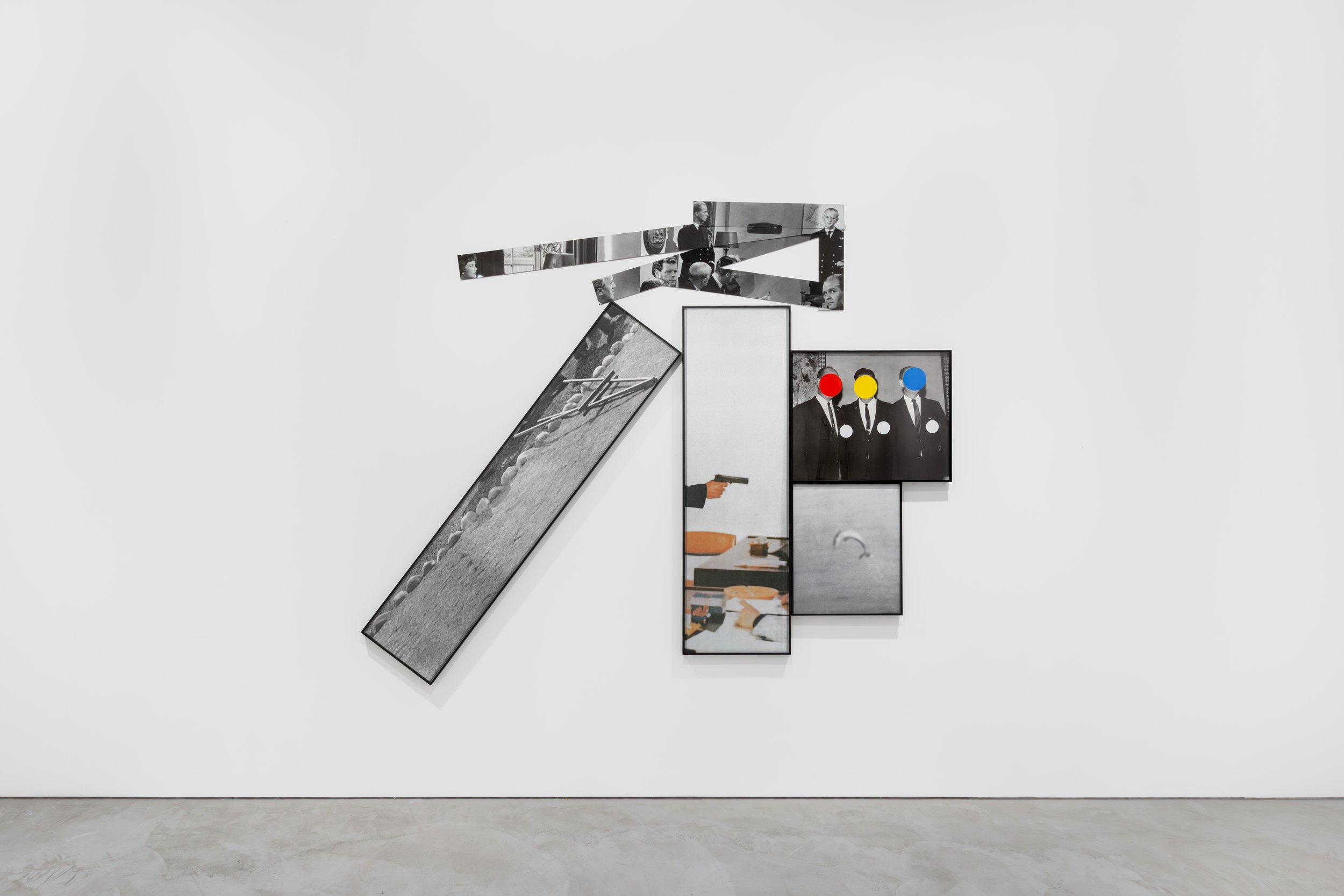 Though all three of the artists in the exhibition share a playfully subversive approach to form and narrative, the exhibition foregrounds a set of contrasts, particularly in terms of medium, tone and voice. John Baldessari’s The Fallen Easel (1988), a dynamic composition of nine monochrome photographs, inhabits the gallery as a wry interlocutor between Farrag and Forrer. In one of The Fallen Easel’s images, the faces of three besuited men are obscured by the artist’s trademark circles of primary colours, while in another, tightly cropped into a long horizontal format, we see an easel pushed to the ground as if abandoned by a frustrated painter. Working with found photographs and film stills, Baldessari asks questions about origins and authorship, as well as the instability of narrative in pictorial art.