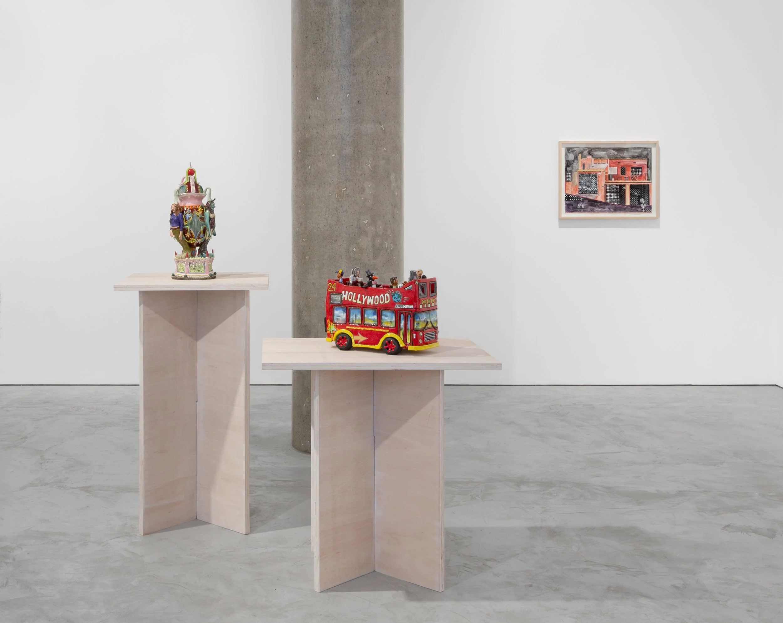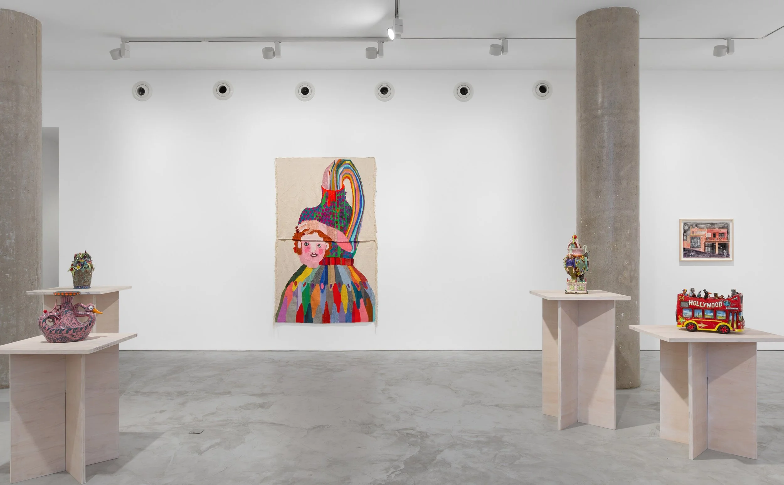 Despite both artists drawing upon popular forms of storytelling, from comic books to myths, the medium-specific experience of looking at their work is vividly different. The smooth, glazed surface of Farrag’s ceramics evokes a sense of luxuriousness even while the energy and characters seem to subvert that association. Where Farrag’s sculptures express a centrifugal force, Forrer’s woven works conjure an interiorised space, in a medium that evokes domesticity and humility, if also synonymous with fairy tales and historical dramas. And while Farrag’s work reveals the strange, surreal surface of urban life, not least in a work such as Dead Man’s Party (2026), an open-top double-decker bus that serves to unify London and LA, Forrer’s dives deep into our unconscious, revealing, in the warp and woof of her tapestries, our darkest conflicts and desires.