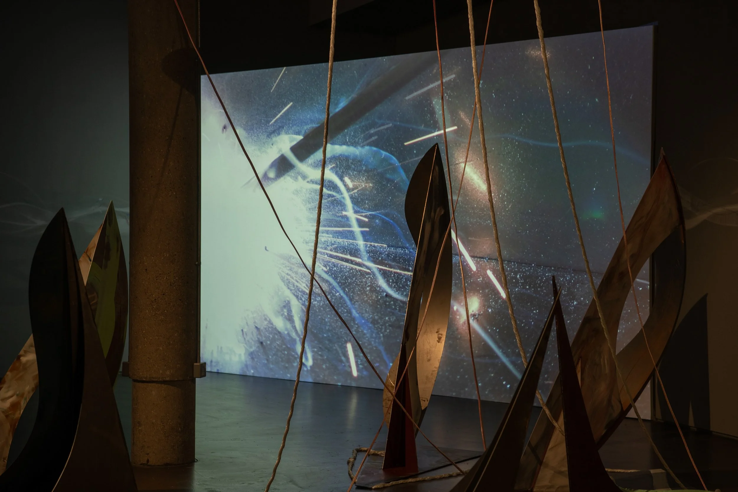 The title The Ribs Begin to Rise is a line from a shipbuilding magazine from the ‘40s which includes a really beautiful and poetic description of the life of a ship being built and launched. The ribs rising is in reference to the first stage of the ship taking place. I was struck by this very bodily term for a monumental structure, for me it has a double meaning which also connects with our own ribs rising as we take breath. When we breathe half of our oxygen comes from the sea which puts us in an interconnected cycle with water and the earth. This cycle between body, water and industrial material is embedded within my new installation combining steel sculpture, video and sound. The video and sound elements were recorded on a walk from the site of Pallion shipyards to Roker. I grew up in Pallion and I remember the sense of freedom of first walking down the River Wear to Roker myself, so I wanted to connect these two places in my work. My approach has been semi improvised in the sense that I wanted to be guided by the landscape, I was drawn to the rewilding of the post industrial riverside in this period of transition for the city. The wildflowers became a metaphor for strength and resilience. The simple structure of grasses and wildflowers that grow in-between human industrious activity always find a way to find light and grow.